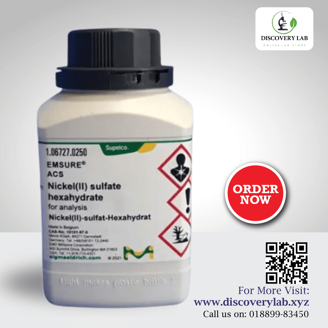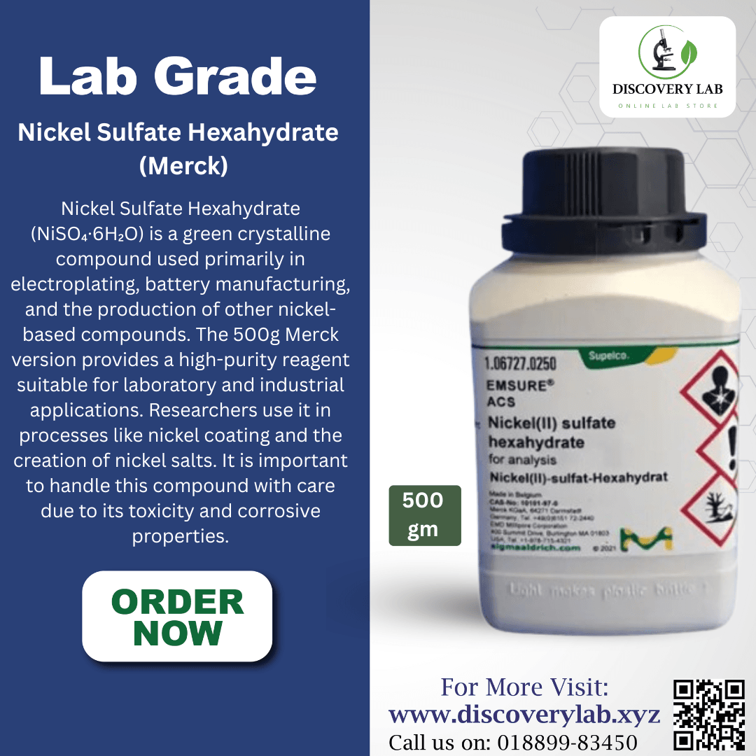 Nickel Sulfate Hexahydrate (NiSO₄·6H₂O) is a green crystalline compound used primarily in electroplating, battery manufacturing, and the production of other nickel-based compounds. The 500g Merck version provides a high-purity reagent suitable for laboratory and industrial applications. Researchers use it in processes like nickel coating and the creation of nickel salts. It is important to handle this compound with care due to its toxicity and corrosive properties.Click to Know More