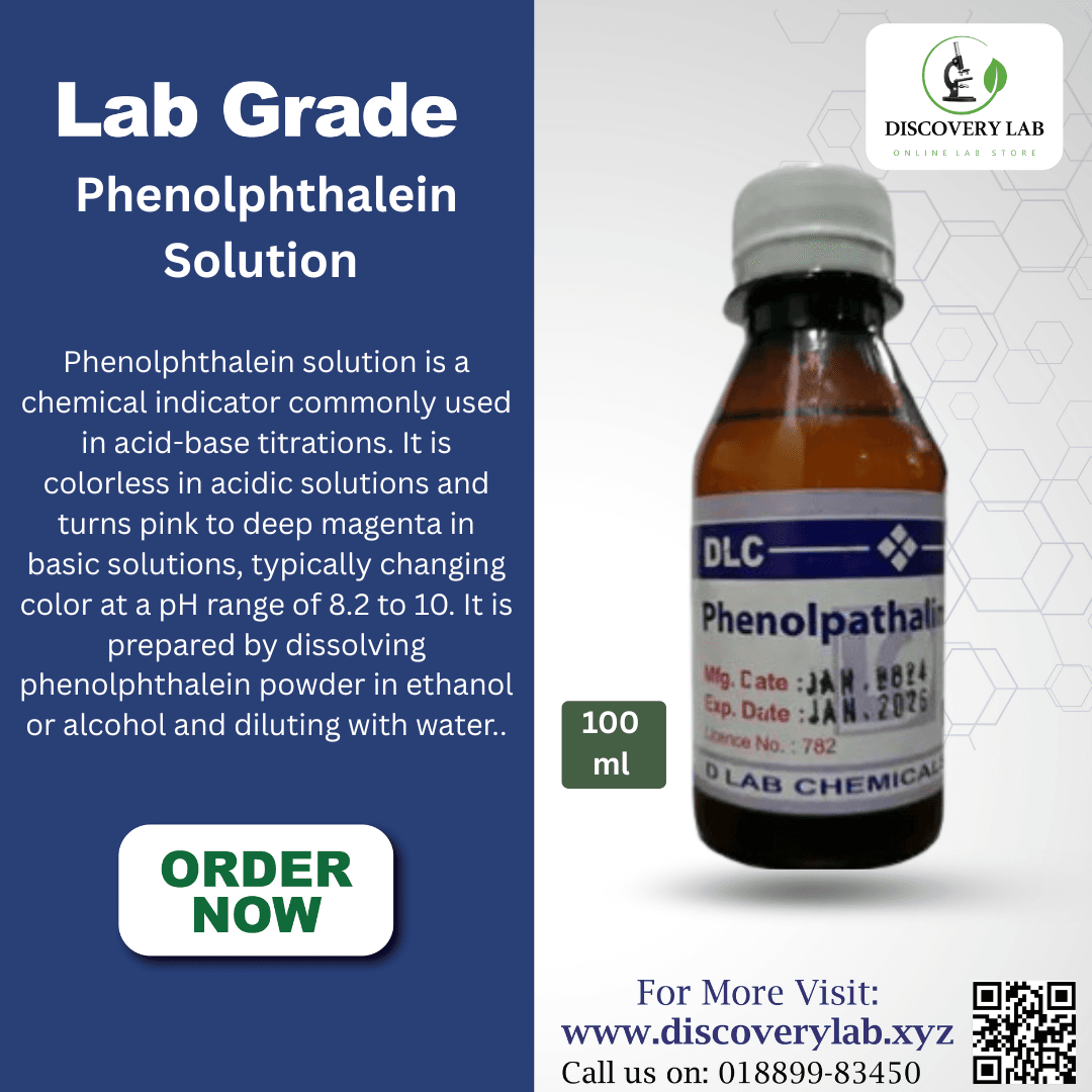 Phenolphthalein Solution is a chemical compound with the formula C₂₀H₁₄O₄ and is often written as “HIn”, “HPh”, “phph” or simply “Ph” in shorthand notation. Phenolphthalein is often used as an indicator in acid-base titrations. For this application, it turns colorless in acidic solutions and pink in basic solutions.